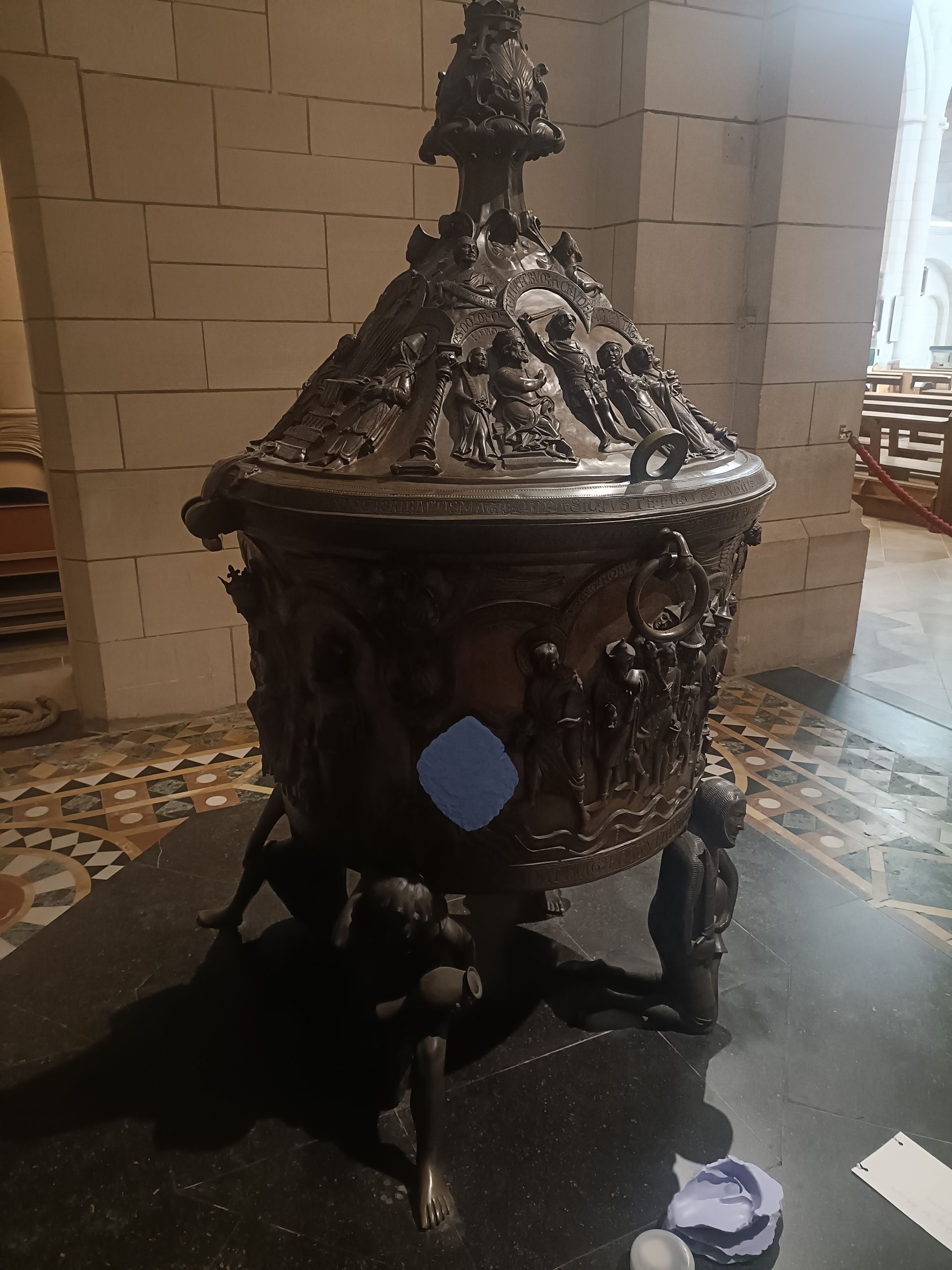 There were several ‘wow’ moments along the way. One that stands out was being invited behind the ropes at Buckfast Abbey to take a cast of the font—a space normally closed to the public. The Fathers were incredibly generous, and standing there, making a mould of such a sacred and historic object, felt like a real privilege. Capturing a detail from the Dalle de Verre window—designed by Father Charles Norris—was another significant moment. His work has long been an inspiration to me, and it was an honour to include that influence in this piece.