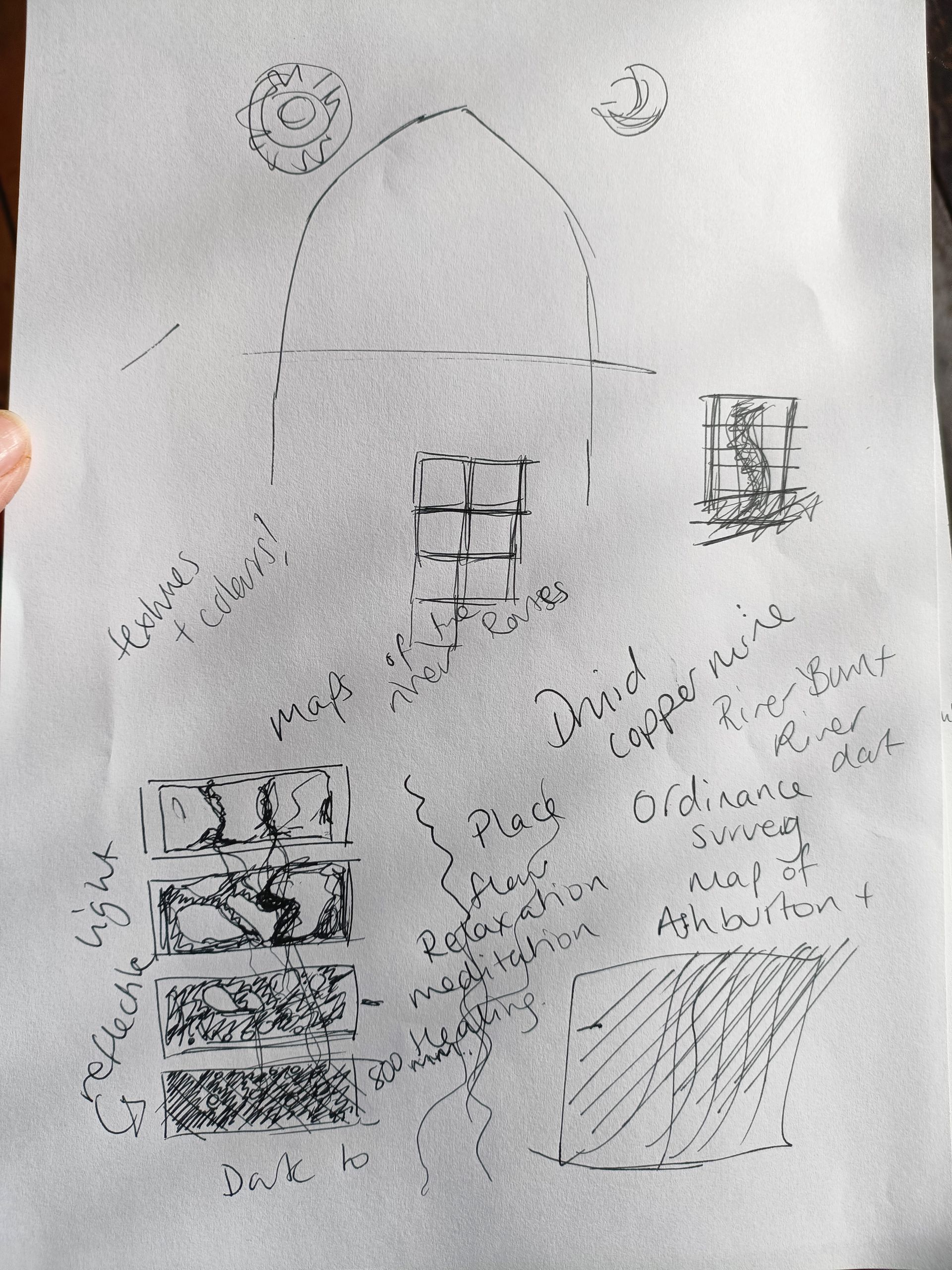 The design process takes quite a few forms, I did a lot of drawing, sketches, rough notes, and even paintings as I was developing my ideas. I knew that I wanted to capture the textures of the town, to celebrate the river and the dappled light through trees. I realised that I needed a repeatable shape to help me in the process of making as all of the textures would be different. Luckily glass in it's molten state behaves like water, it flows and fills the void that it is placed in. When solid glass reflects and refracts light similarly to water too, so some decisions were easy to make. Choosing to work with blues and yellows to represent the sun and the river. I had been able to purchase some beautiful light blue recycled glass from a studio, this immediately gave me a distinct colour to work with that wasn't off the shelf.
