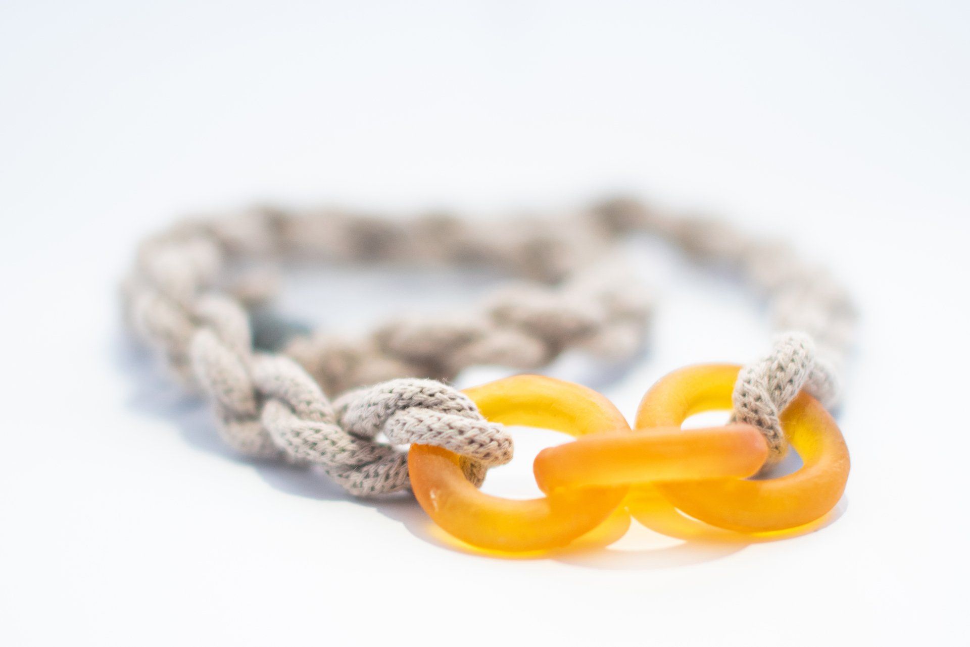 Combining 100% recycled cotton or hand woven hemp cord with cast glass to create colourful jewellery.